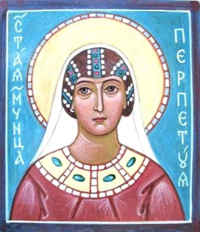 Свята мучениця Перпетуя походила з роду патриціїв і жила в Карфагені. Таємно від свого батька, переконаного язичника, вона прийняла святе Хрещення, увірувавши в Спасителя, і сподобилася мученицької кончини разом зі своїм братом Сатиром, служницею Філіцітатой та юнаками Ревокатом, Саторнілом і Секундом, які також готувалися стати християнами. Незважаючи на вмовляння батька, що наполегливо взивав до її материнського почуття, рано овдовівши 22-річна свята Перпетуя подолала земну прихильність до улюбленого свого немовляти заради Життя Небесного.