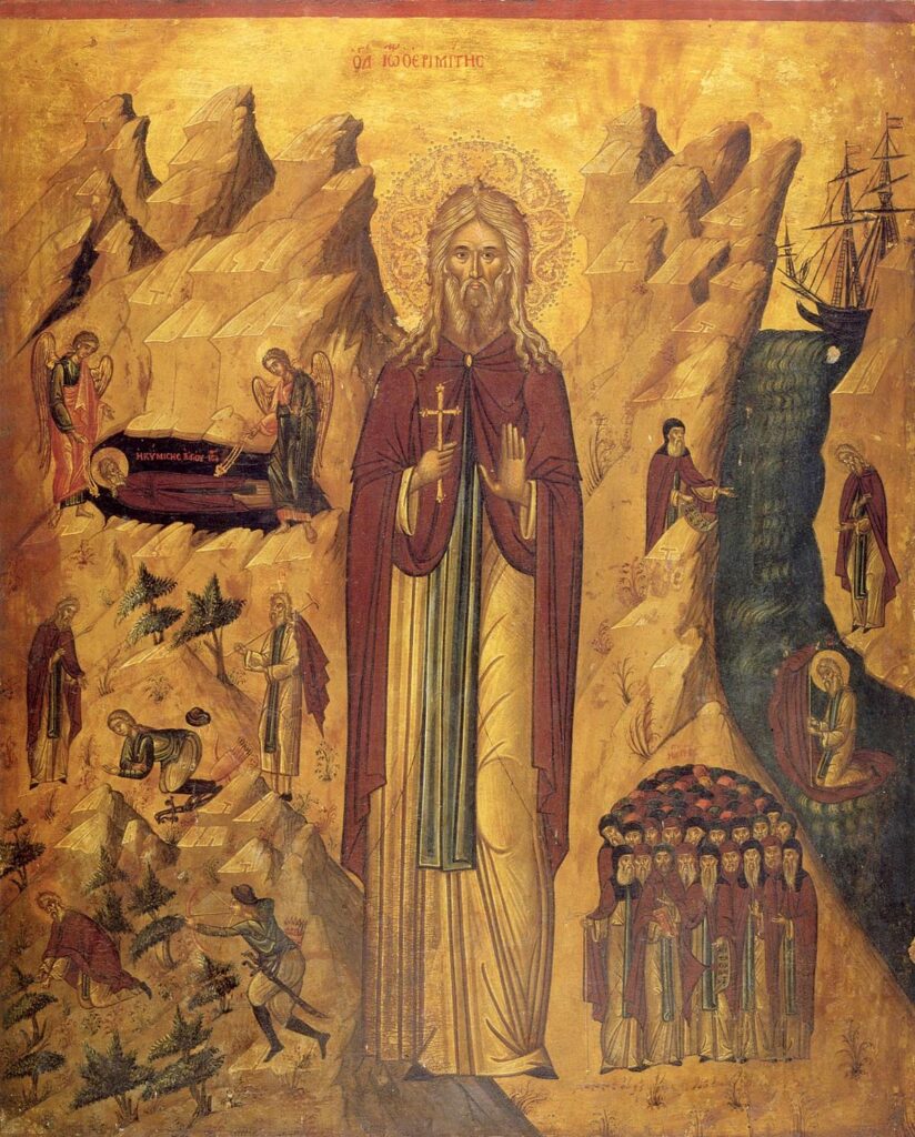 Іоанн вирушив до пустельника Фармуфія і, прийнявши від нього благословення, пішов у пустелю. Молодий подвижник знайшов порожній глибокий колодязь, в якому було багато змій, скорпіонів та інших гадів, і, помолившись, кинувся вниз, але, чудесно підтриманий Ангелом, залишився неушкодженим. На дні колодязя він провів у молитві з хрестоподібно складеними руками без їжі і сну сорок днів, поки змії не покинули колодязь. Одного разу Ангел, що приносив їжу пустельнику Фармуфію, приніс хліб і для святого Іоанна. Ангел не приносив хліб прямо Іоаннові, щоб юний подвижник не возгордився. З тих пір святий отрок отримував Небесну їжу через Фармуфія. Юному подвижнику довелося випробувати багато спокус від диявола. Біси приймали образ матері, сестри, родичів і знайомих святого Іоанна, щоб розжалобити подвижника і змусити його перервати подвиг. Всі вони з плачем по черзі підходили до колодязя, просячи преподобного Іоанна вийти до них. Весь цей час святий не припиняв молитви і після закінчення її вимовив: “Відійдіть від мене”, – і біси зникли.