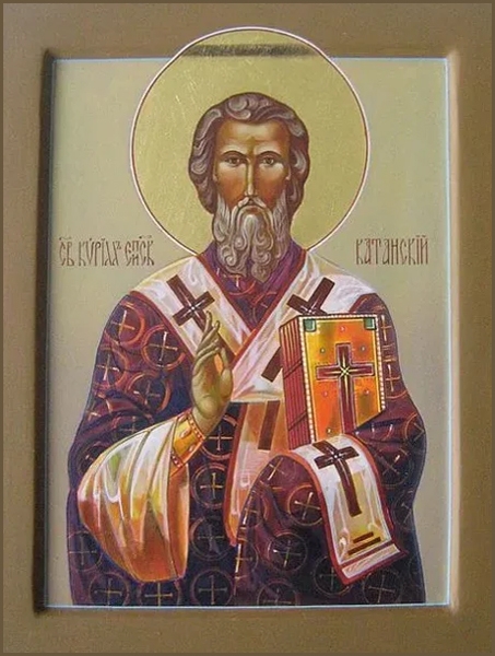 Святитель Кирил, єпископ Катанський (І-ІІ) народився в Антіохії. Він був учнем апостола Петра (пам’ять 12 липня, 29 січня), який поставив його на єпископа міста Катани в Сицилії. Святитель Кирило мудро управляв паствою, був побожний і удостоївся від Господа дару чудотворення. За його молитвою гірка вода в одному джерелі перетворилася на питну, втративши гіркоту; це чудо навернуло до християнства багатьох язичників. Святий Кирил упокоївся в глибокій старості і був похований в Сицилії.